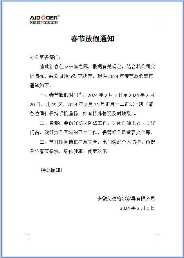 【艾德格爾全屋定制】關(guān)于2024年春節(jié)放假事宜的通知